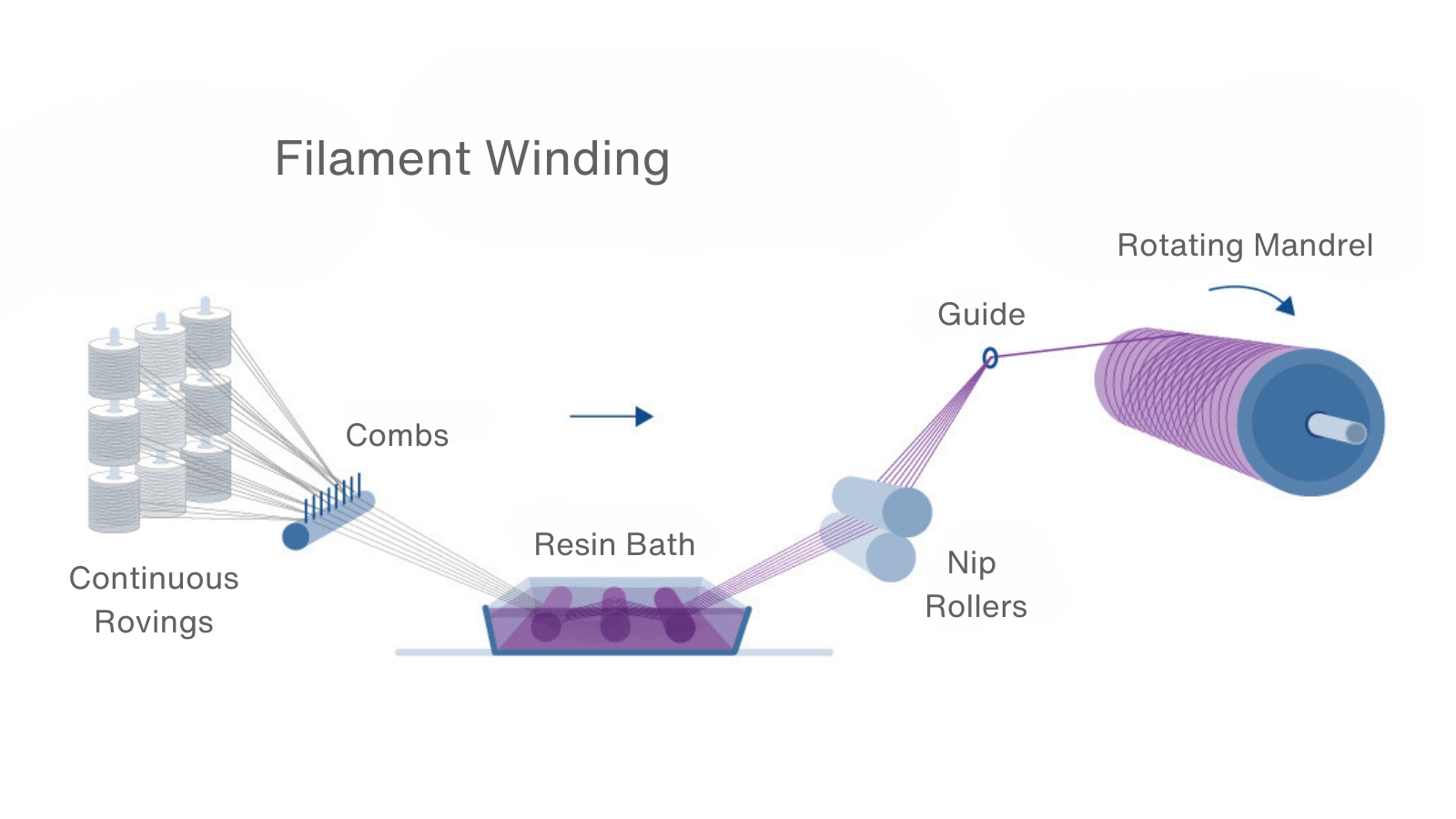 The filament winding process can incorporate a variety of resin systems and fiber types depending on the end-use part application. In this process, continuous rovings, yarns or tow are first pulled through a catalyzed resin bath. Excess resin is removed from the fibers which are then guided onto a rotating mandrel or mold via a carriage arm that moves along the length of the mandrel ensuring the fibers are evenly applied. The movement of the carriage arm and the rotation speed of the mandrel are synchronized through automated controls to achieve precise fiber placement and structural integrity of the laminate. Once the desired laminate thickness is achieved, the part is allowed to cure either at room temperature or with the addition of heat and is then removed from the mandrel for additional processing.